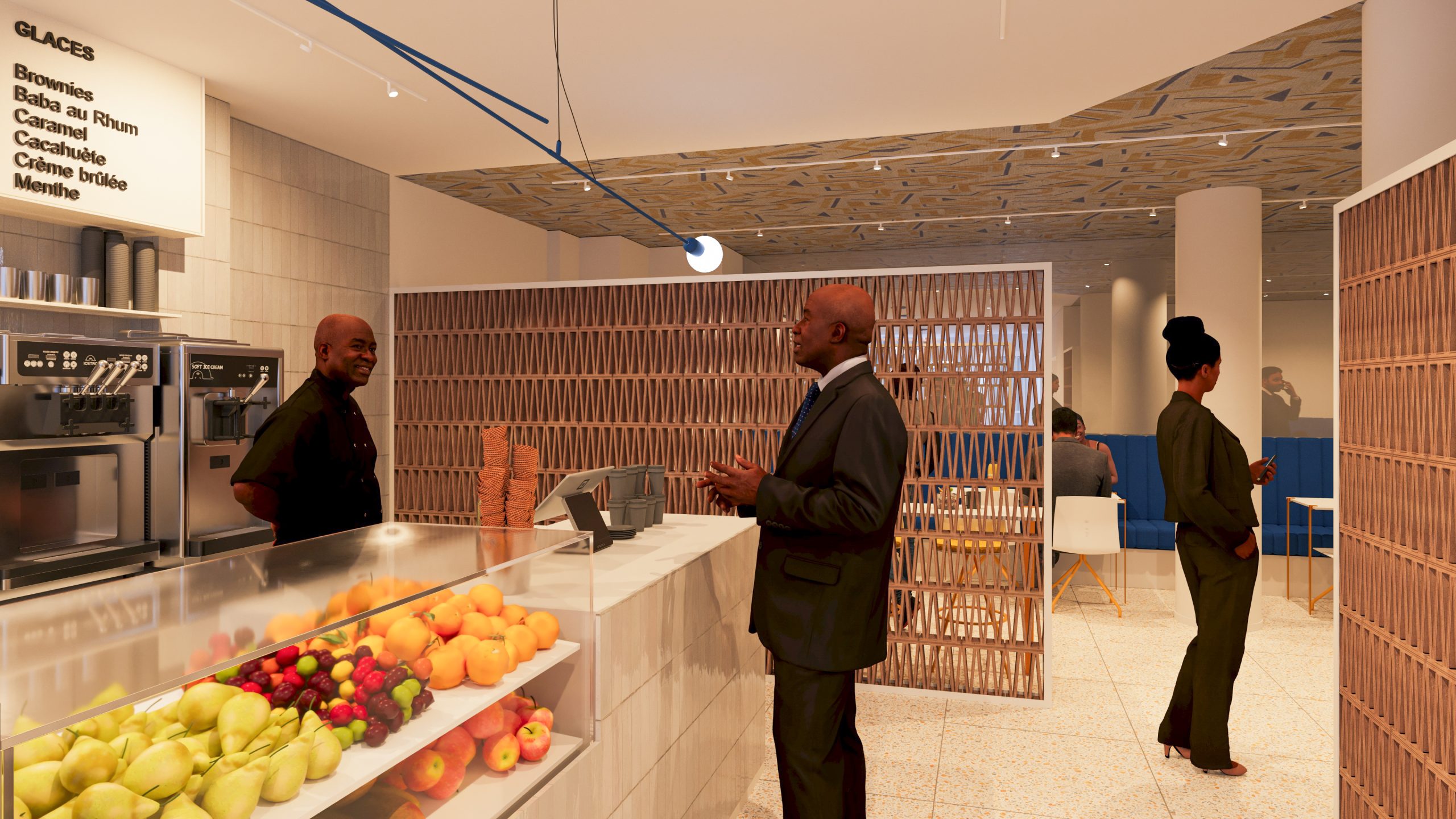 La signalétique appuie, elle, une répartition des espaces et des circulations plus directes. Le client arrive à se diriger en toute autonomie vers les ascenseurs menant au spa ou au rooftop, un large escalier qui conduit au restaurant, les sanitaires ou à l’opposé la boulangerie qui s’ouvre sur le hall pour offrir dès l’entrée un lieu de conso-convivialité.
