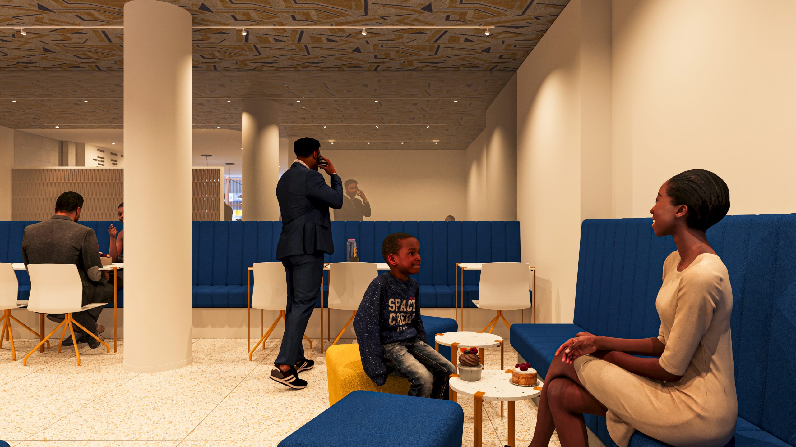 Après cette partie vente, la circulation naturelle mène au fond de la boulangerie, vous trouverez l’espace de consommation, comme un salon de thé. Chacun peut choisir l’expérience de consommation qu’il souhaite : un espace solitaire avec des tables en mange-debout, des tables offrant une liberté d’agencement selon les tailles des groupes et un petit salon en banquette et poufs.