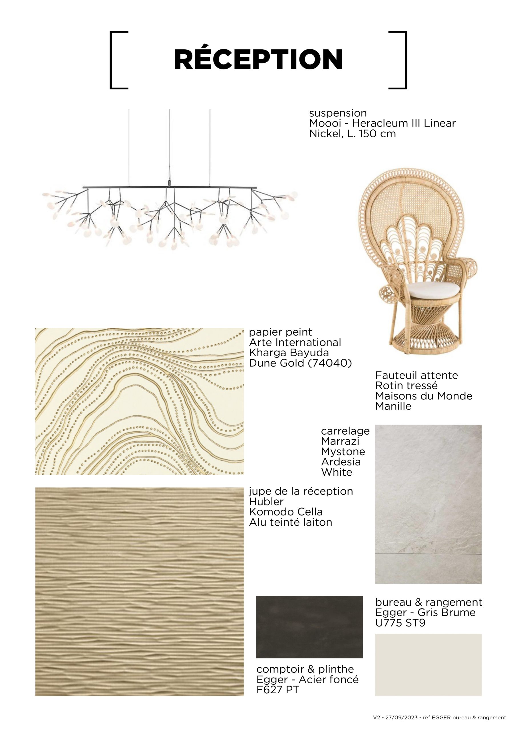 Face à l’entrée se déploie une banque d’accueil linéaire, avec une jupe dorée et ondulée et un arrière-plan rappelant ces ondulations. Ces deux éléments en relief offrent des matérialités complémentaires qui jouent avec la lumière pour mettre en valeur le nom du lieu.
